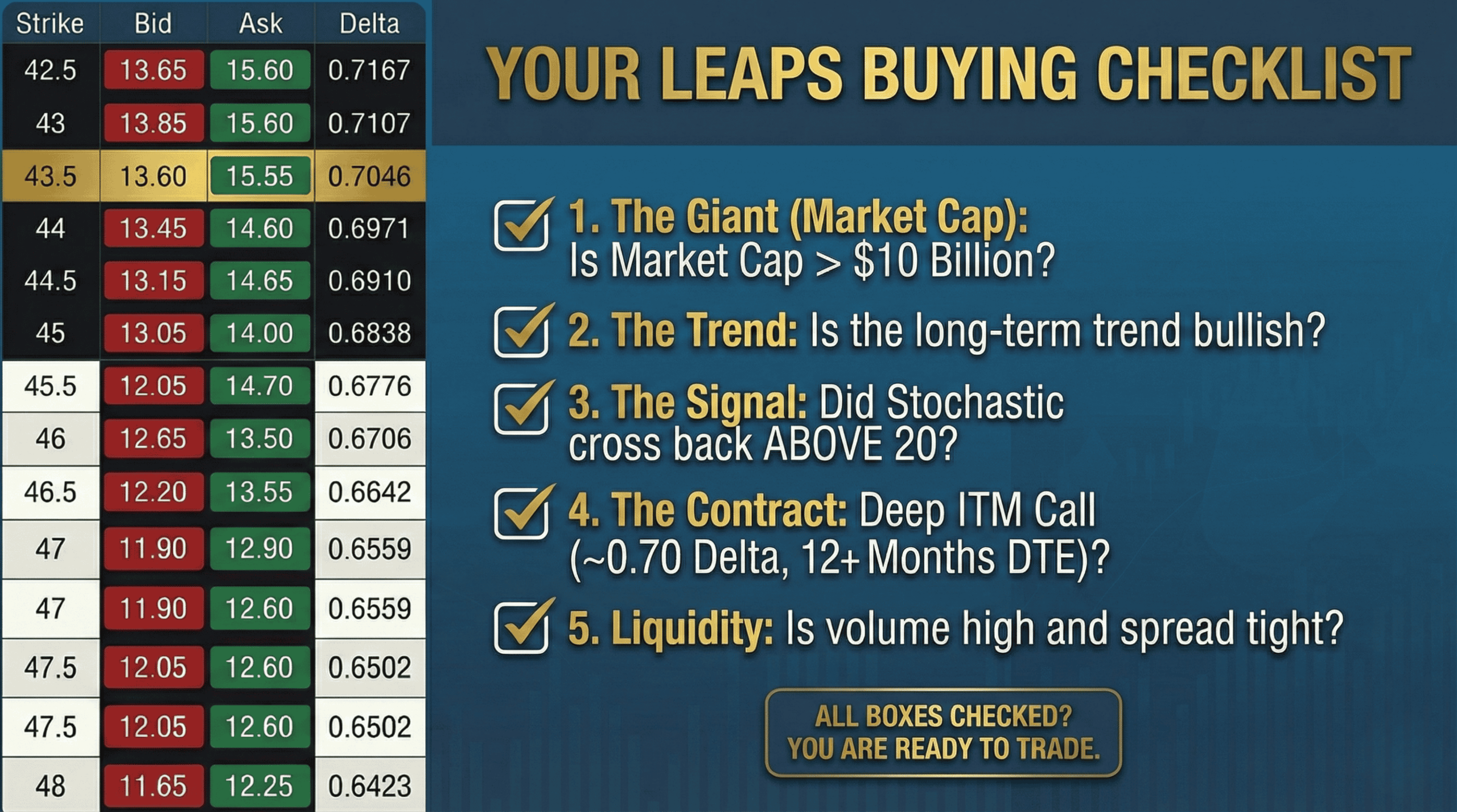 4. The Contract: Am I buying a contract with a ~0.70 Delta that expires in 12+ months?