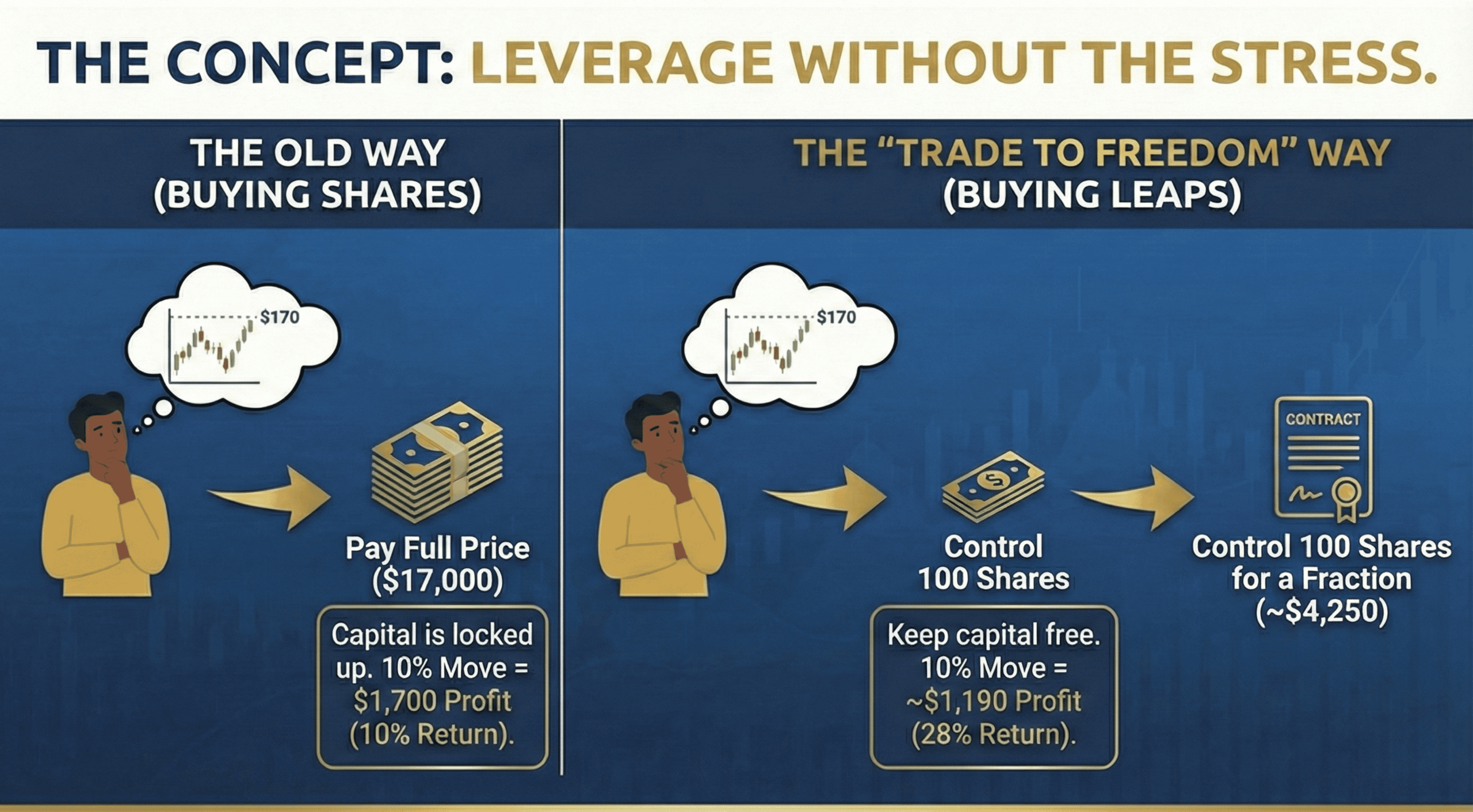 The "Trade to Freedom" Way (Buying the LEAP): Instead, you buy the 43.5 Strike Call for $15.55. Since options represent 100 shares ($15.55 x 100), you control the same 100 shares for just $1,555.00.