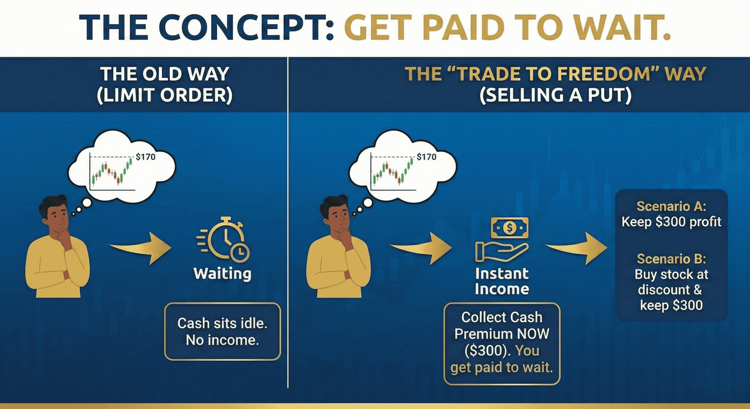 The Old Way: You set a "Limit Order" to buy at $170 and you wait. If it never drops to $170, you never buy the stock. Your cash sits there, earning nothing.
