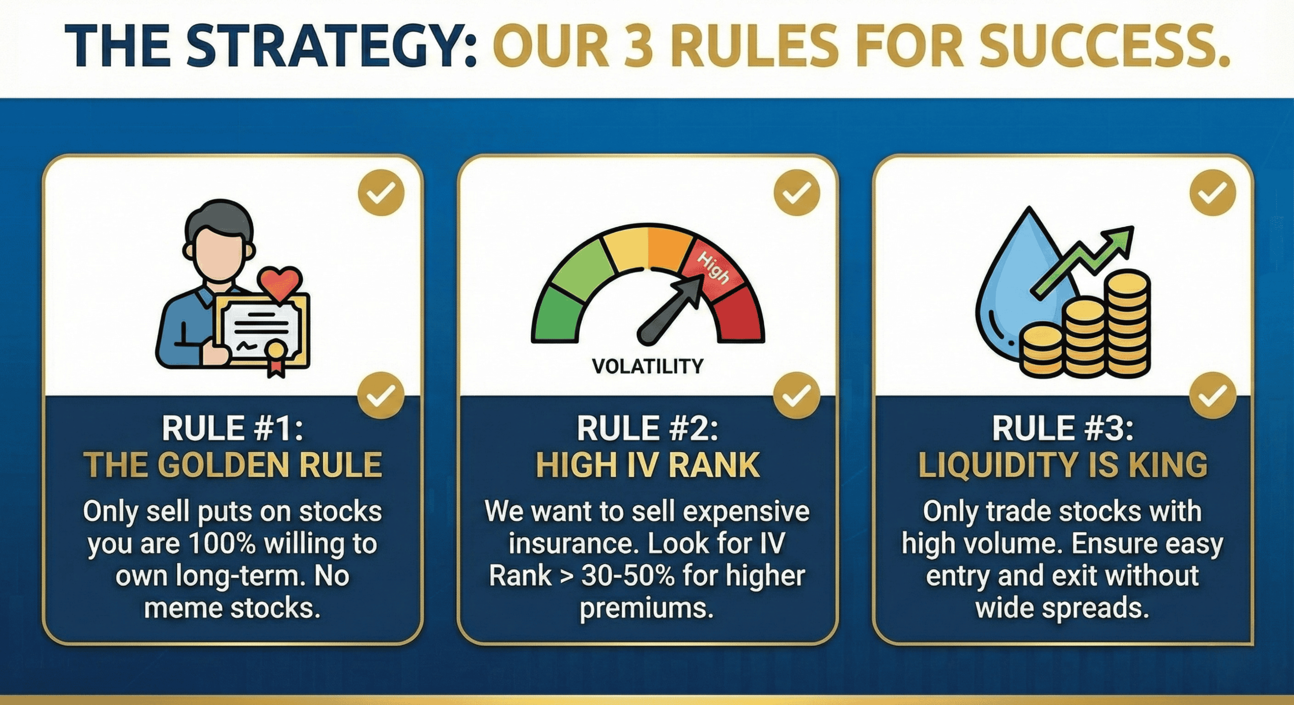 Rule #2: High Implied Volatility (IV) Rank We want to sell expensive insurance, not cheap insurance. When market fear is high, option premiums become expensive. We look for stocks with an IV Rank over 30-50%. This means we get paid more for taking the same amount of risk.
